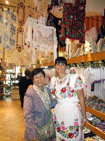 昼食は、スープの美味しい町中のレストラン。パプリカで味付けしたグヤーシュという具沢山スープ。各家庭で少しずつ味付けや材料が違うとか。今日は牛肉だが、鶏肉や、魚を入れる家もあるとかで、ハンガリー版お袋の味。テーブルに赤、緑の唐辛子が置いてある。辛みが足りない人は足すようにとのこと。サラダに足す人もいますよ、との説明に、試しに口に入れた人は『辛い!』