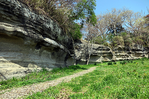 ちょっと戻るようだけれど見ていこうと下りて行きましたら、高さ3~10mの凝灰岩の断崖が尾根に沿って連続する景観に見に来てよかったと思いました。