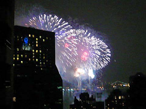 パトカーや、ヘリコプターが多くみられました。始まる頃にはおそらく空軍の飛行機だとおもいますが、マンハッタンの上を何回も通っていました。一番大きい花火は国連の近くから南側のイーストリバーの艀から打ち上げられます。メイシーズというデパートがスポンサーを毎年しています。その他にもブルックリンブリッジのあたり、コニーアイランド辺、小規模なものはあちこちで、催されます。