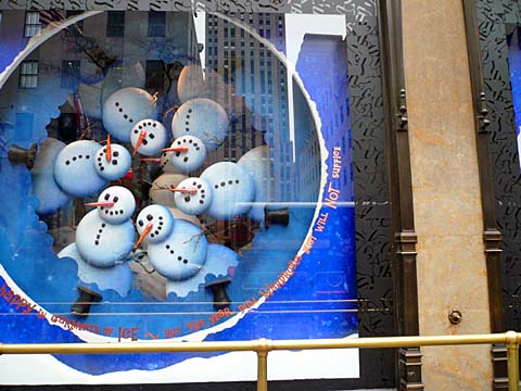 どこでもこのシーズンは飾り付けに趣向をこらしますが、一番の人気は大きなツリーと共にデパートのショーウィンドウです。各デパートは早くから、テーマを決め、専属のデザイナー達が制作します。一つのデパートに大きなウィンドウが沢山有り、人通りの多い通りに物語にそったディスプレーがされ、歩道は綱が張られ順番に見られるようになっています。ほんの一部ですが、サックスフィフスアベニューの今年のウィンドウから2面ほどをお届けいたします。今年は雪だるまですが、こちらではスノーマン、其の名のようにこちらは丸が3つ、だるまではなく、人です。写真では判りませんが、電動で動き、見ていて楽しい物です。前はいつも人が並んでいます。