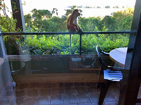 | ジープサファリで見るゾウの群れ | シギリアのホテルのベランダに来る野生猿 |